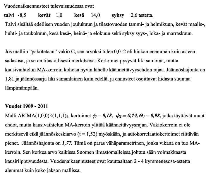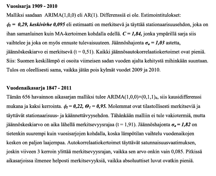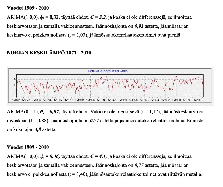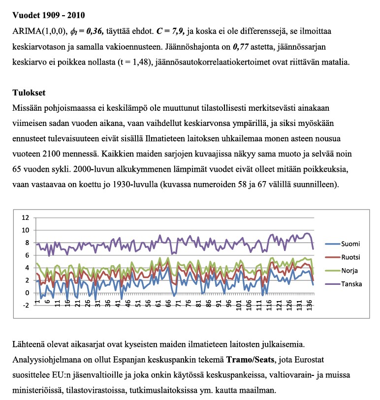 Tilastotieteen lehtori Pekka Hjelt: Missään Pohjoismaassa ei keskilämpö ole muuttunut tilastollisesti merkittävästi ainakaan viimeisen sadan vuoden aikana, vaan vaihdellut keskiarvonsa ympärillä.